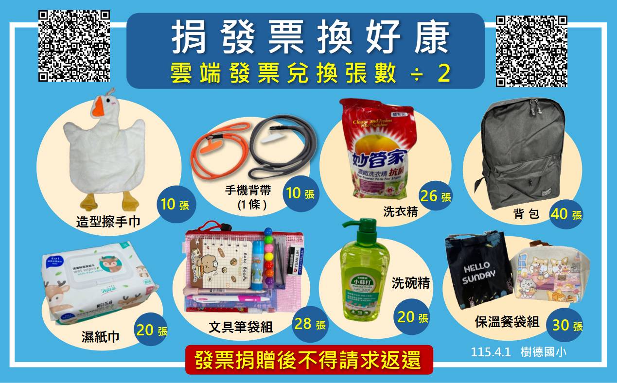親愛的家長 4/1當天除了有好看的表演節目與有趣的跳蚤市場外,我們還和稅務局共同辦理租稅教育推廣活動,歡迎孩子帶發票來兌換精美禮物喔! 學務處敬啟